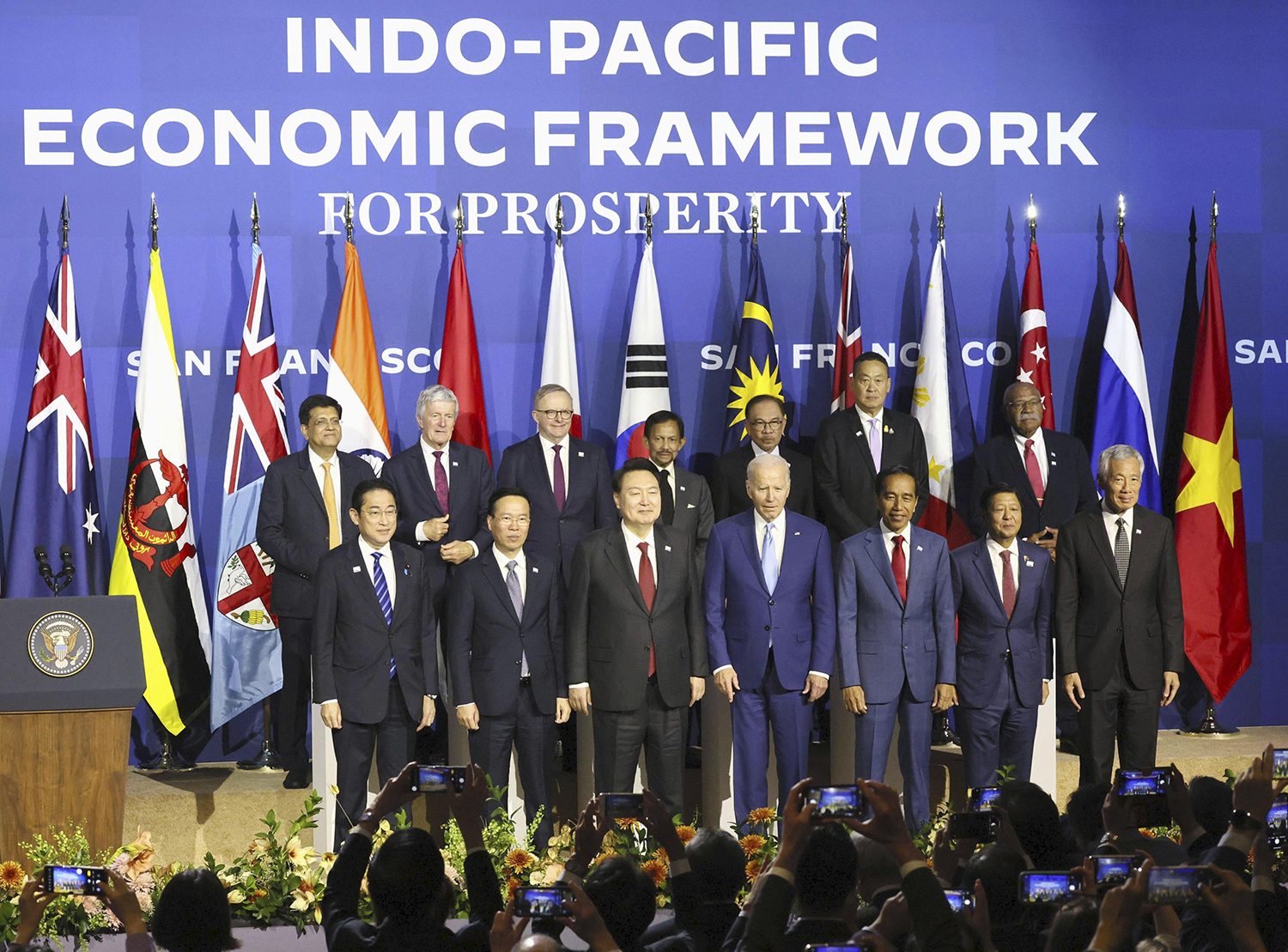 Cover photo: Participants of a summit on the economic initiative called the Indo-Pacific Economic Framework attend a photo session on Nov. 16, 2023, in San Francisco. Pool photo. Kyodo via AP Images.
