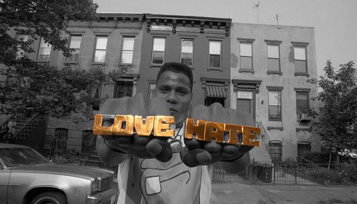 The film takes place over one scorching summer day, following more than a dozen characters — black, white, Puerto Rican, Korean, old, young, male, female, intellectually disabled — in Bed-Stuy as their lives repeatedly collide, with harmonious and hateful results. As the day wears on and tensions rise, Sal (the Italian-American owner of a local pizza joint) snaps, hurls a racial epithet, and provokes a brawl. The police are called, try to quell the fighting by force, and in so doing strangle to death Radio Raheem, a young black man known for his suitcase-sized boombox. A riot ensues. In the end, Sal’s pizza shop is burned to the ground, and we’re left to answer who, if anyone, did the right thing.