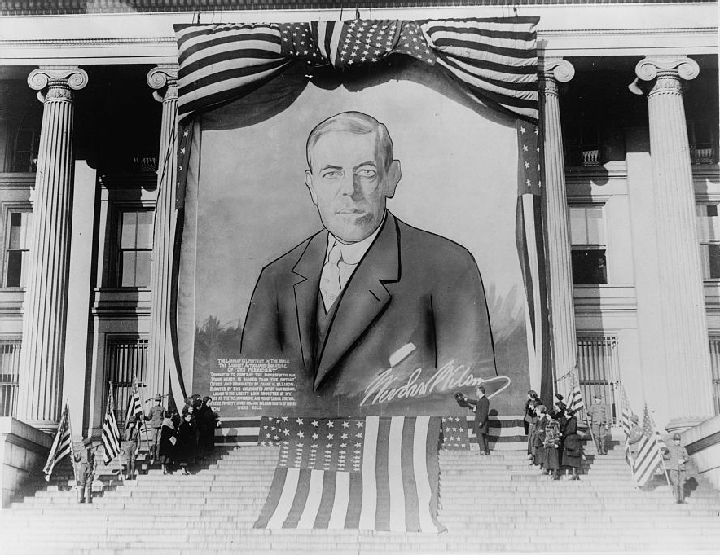 Cover photo: A banner-size painting of Woodrow Wilson hangs from a building, circa 1920. The caption partially reads: "Originated to portray the bigness of the man whose heart is bigger than the portrait." (Courtesy of the Library of Congress)